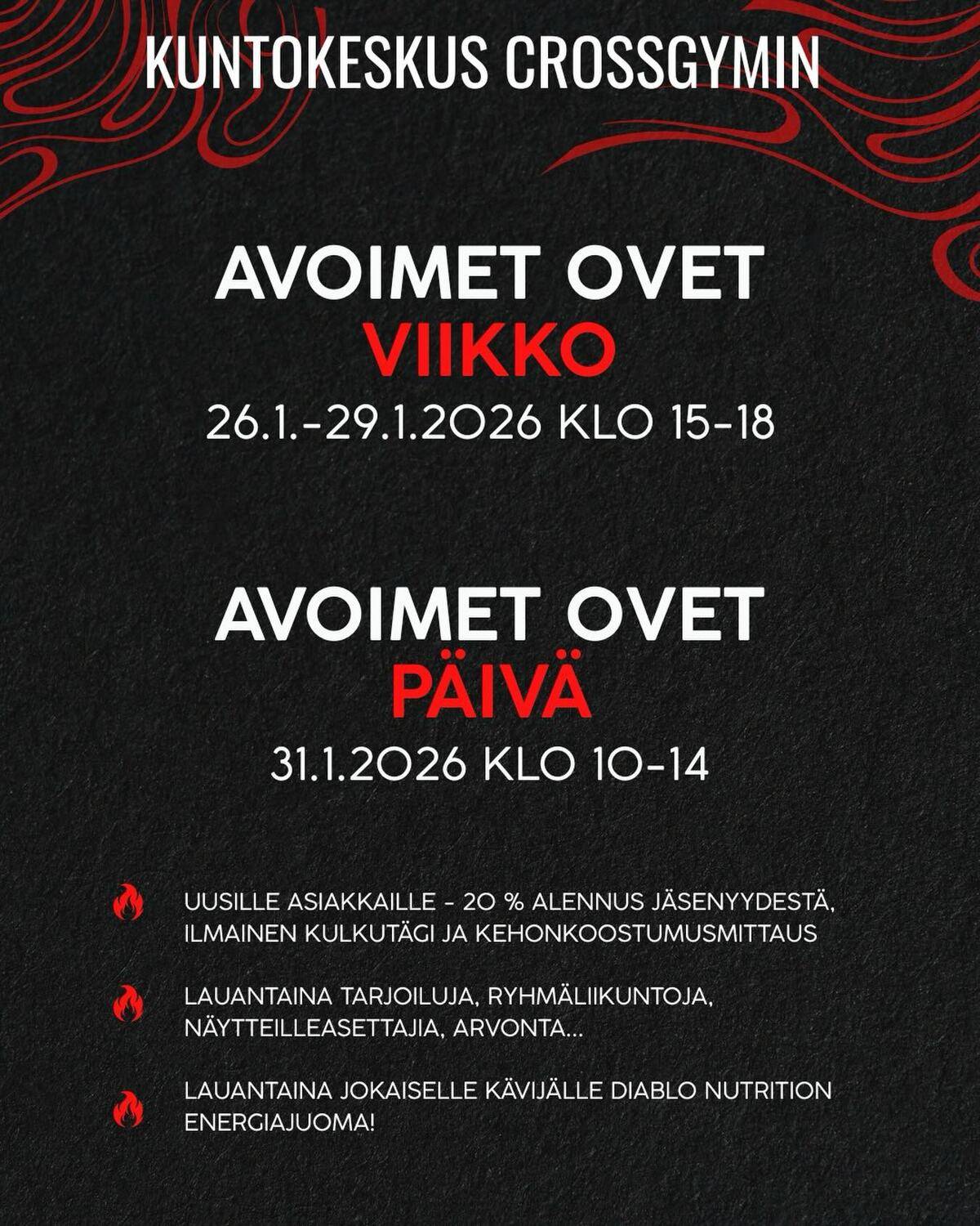 Koko viikon avoimet ovet! Olet tervetullut tutustumaan ja treenaamaan CrossGymin monipuoliselle ja uudistuneelle kuntosalille. Ovet on avoinna aina vastaanoton aukioloaikoina, eli ma 26.2. – to 29.1. klo 15-18 ja vielä pääpäivänä lauantaina 31.1. klo 10-14.